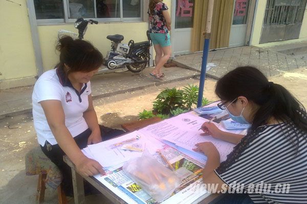 沂水支队由口腔医学院学生杨晓丽、赵波等组成。上午,团队在圈里镇集合完毕,简单交流后迅速展开工作。展台、桌布、遮阳伞、宣传册、问卷等一一布置开来,不一会儿便有乡亲过来询问。义诊过程中,队员交替进行填表和检查工作,在保证了工作新鲜度的同时让每个人得到实践的机会。工作时遇到不识字的老人,队员耐心地进行询问调查,传达正确的口腔保健方法,并仔细检查老人的牙齿状况,提出可行的建议。下午烈阳高照,路上行人减少,团队采取走访的方式进入居民家中调查,虽效率不高,但收获尚可。