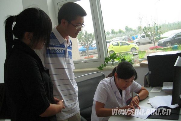 上午,各位同学在大骋车站集合,带着关于莱州市城市居民体检情况的相关问题及调查问卷,Angel of mercy社会实践团队的全体成员开始了今天的走访之旅。一路上队员们相互讨论着前期问卷调查的结果,讨论着为医院负责人和体检科主任准备的问题是否合情合理等问题,为今天的活动做准备。 来到莱州市人民医院,向导医台的护士说明来意之后,队员们被带往体检中心,参观相关的大型体检设备。体检科的安医生向大家介绍了各个仪器设备的功能及人民医院的特色检查项目,随后队员们在办公室展开了对安医生的访谈及调查问卷。