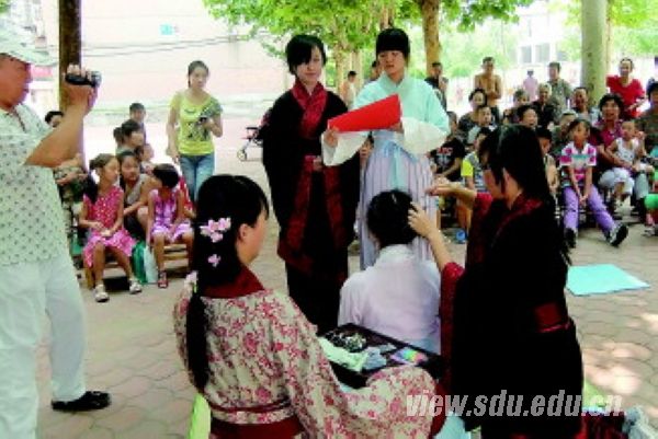 表演及笄礼的是山东大学国学社的学生们,国学社相关负责人李治华表示,他们都是国学爱好者,暑假里希望通过表演、游戏、讲座等形式,在社区和孩子中间传播国学文化。