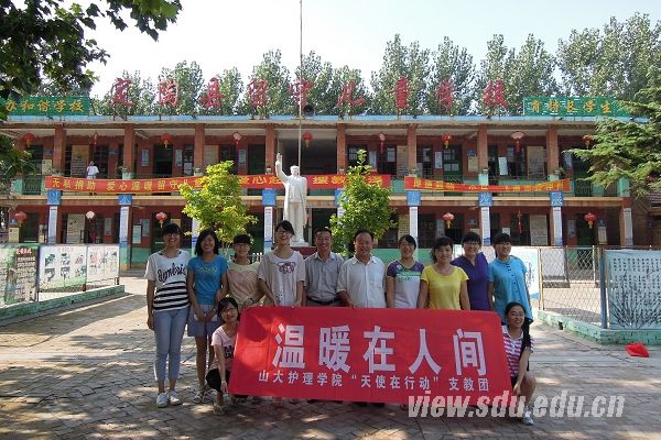 下午,“天使在行动”支教队与山东科技大学支教队及青岛科技大学支教队完成交接后,与校级领导合影留念。队员们十天的付出与努力得到了当地领导的肯定,儿童学校校长刘传玺表示期待与支教队的再次合作。