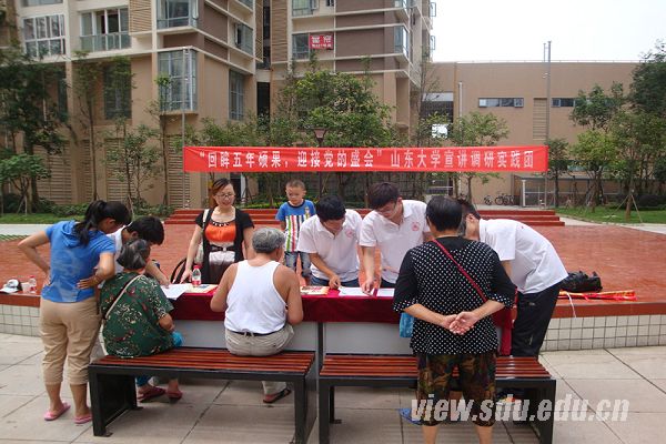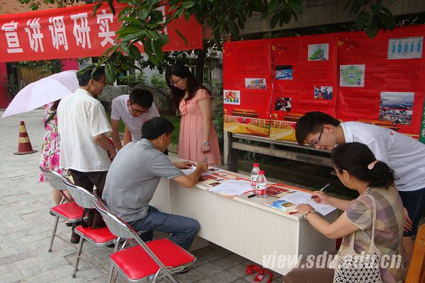 队员在社区便民服务中心统一身着印有“山东大学”字样白色队服,拉起大型宣传横幅,贴好精美宣传海报,向每位前来参观的社区居民讲解相关情况。在崇德社区广场举行的宣讲活动,吸引了大批居民积极参与。同学们热情的态度和丰富的知识得到了社区居民的一致肯定。队员们在宣讲的同时还采访了社区的主要负责人,在认真听取的同时,做好音频视频记录,搜集到许多宝贵的一手资料。社区主任感谢队员所做工作的同时,也介绍了被评为国家级社区建设示范项目的新市民服务中心的建设状况。他谈到,像崇德社区等由于土地征用而建设的新兴社区非常需要像队员们这样的大学生来开展类似的宣讲活动,提高社区居民的整体文化素质。