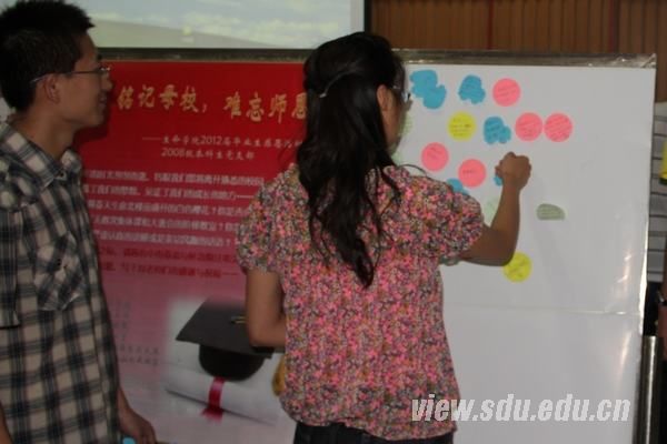 6月25日,08级本科生党支部举办了以“为母校发展建言献策,展现毕业生党员感恩情怀”主题的建言献策活动。全体毕业生党员从自己在山大的四年经历入手,结合今天党课上的学习,用手中的笔将自己对山东大学四年的感情化为句句文字,写下自己对于山东大学最真挚的祝福和最诚恳的建议。“以一种更加开阔的心态办学,为同学们提供更多的比如到其他更好院所或者出国交流的机会”、“能够免费的开放体育馆,给同学们提供一个更好的锻炼身体的场所”等建议显示了同学对母校争创世界一流大学的美好祝愿。