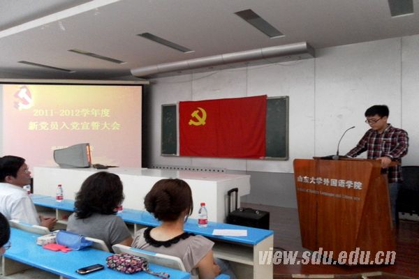 [本站讯]6月15日下午,外语学院举行2011-2012学年新党员入党宣誓大会。外语学院党委书记郑倩、党委副书记曾志英出席大会,大会由学院党委副书记高弟主持。