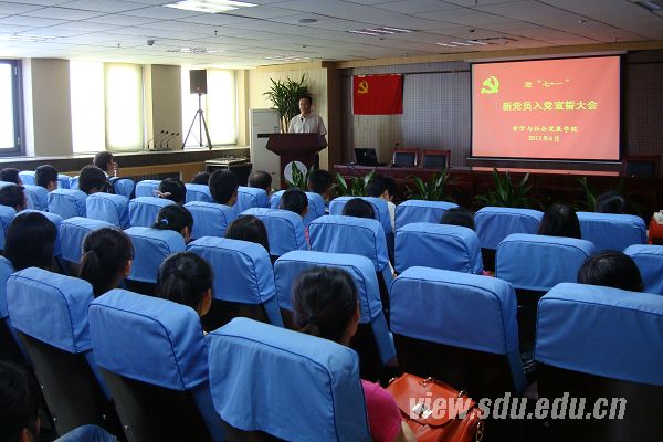 大会在雄壮的《国际歌》中开始。在领誓人胡璞心同学的带领下,全体新党员面向党旗,举拳庄严宣誓,郑重地表达为共产主义事业奋斗终生的决心。宣誓完毕,新党员代表赵彧同学发言,表达了对党组织的热爱与向往和为人民服务的坚定意愿,体现出努力进取、积极向上的良好道德情操;同时,他还代表全体新党员向组织庄严承诺,既要加强政治理论修养、提高政治觉悟,又要注重提高自己的业务水平和专业素质,将所学知识运用到社会主义建设的伟大实践中去。研究生方垒同学代表老党员发言,对新加入组织的党员同志表示祝贺与热烈欢迎,勉励新党员走有意义的道路,做有意义的事,过有意义的生活,从为人民服务中找到快乐和人生的价值;同时,她表示作为党员应该坚定共产主义信仰,时刻谨记自己作为党员和山大人的身份,充分发挥党员的先锋模范作用,不断创新,锐意进取,为党和人民的事业做出更大贡献。