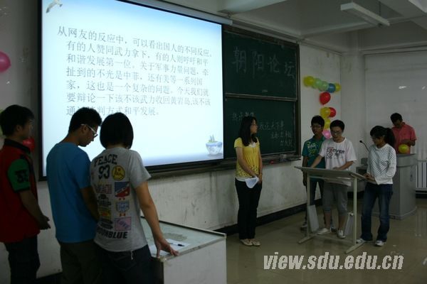 论坛伊始,2011级卓越一班的王伟首先给大家带来主题为“时事就在身边”的精彩演讲,将自己平日对时事关注的积累用演讲的形式展示给了大家,语言幽默,贴近大学生生活,赢得了现场观众的阵阵掌声。王伟的演讲带出了论坛的第一个环节:各团支部就议题陈述观点。该环节中,论坛通过视频、PPT、测验等方式向大家展示了“掷出窗外”网站事件、医闹事件的相关资料;各团支部内部经过一番讨论之后,依次上场发表了各自的看法。他们的发言见仁见智,体现了对时事的热切关注和独到见解。随后,在第二环节中,团支部之间组队参与辩论,就黄岩岛中菲对峙事件中方应采取的解决方式展开了激烈的辩论。大家基于对对峙全过程的了解、对国内各方反映的关注,仅从大学生自身生活出发陈述了自己的观点,激烈的辩论、辩手的精彩发言博得现场所有人的热烈掌声。