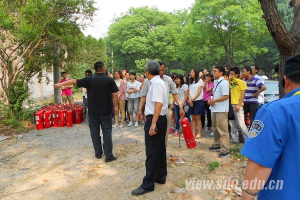 活动中,公安处老师先向大家介绍了火灾逃生技巧,如首先要明确自己所在位置和逃生出口,在逃生过程中要保持沉着冷静,避免拥挤,捂住口鼻,弯腰或匍匐前进等。随后,大家进入教学楼,实地模拟了火灾逃生过程。公安处老师带大家来到药学院实验楼前的一片空地上,向大家讲解了干粉灭火器的使用方法和注意事项:拔下保险销;站在上风处距火焰约1.5m处,一手握紧喷管,另一手捏紧压把;喷嘴对准火焰根部扫射等等。大家6人一组,依次进行操作演练。演练过程中,老师们就出现的问题进行了纠正。