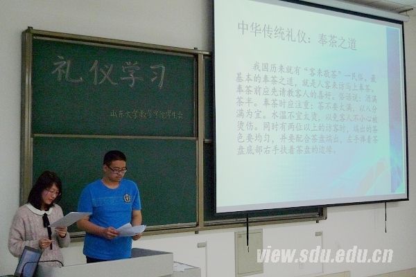 在一段轻松的礼仪小视频后,活动正式开始。秘书处李文睿、孙海峰向大家介绍了传统礼仪,包括行走之礼、见面之礼、入座之礼、奉茶之道等传统礼仪内容;传统拱手礼,现代礼仪中的坐姿、握手等则通过讲解和现场表演展示来呈现,一系列规范的动作、幽默的语言和生动的表情使大家在轻松愉悦的氛围中学习到了丰富的礼仪知识。信息部刘姚睿、刘晓磊讲解书信礼仪和邮件礼仪,书信礼仪涉及到笺文和封文的书写格式与内容,而在邮件礼仪的介绍中,两位同学着重强调了写邮件和发邮件的六大要求,此外,他们还向大家介绍了假条、留言和通知等切实贴近日常学习生活的应用文稿写法。为了使现场气氛更为活跃,主持人发起了一个小型问答,由每个部派出一名代表来回答刚刚介绍过的邮件礼仪中的六大要求。活动之中还穿插了礼仪专家、中国人民大学教授金正昆的讲课视频,其丰富幽默的语言,让大家在欢笑之余对礼仪有了更深刻的理解。礼仪知识竞答环节共包括八个问题,题目均为同学日常生活中可能遇到的各种礼仪问题,如“在告别时应注意什么”、“乘车的礼仪有哪些”等,本环节采用抢答模式,回答正确者获得精美小礼品奖励,现场气氛达到高潮。活动最后,学生会主席郑雪生对本次活动做了简要点评。