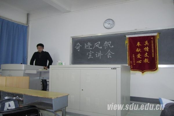 宣讲会由第四届队长张荣华主持,第三届核心队员刘航带领大家回顾了团队历史以及往届活动的感人片段。随后,第三届核心队员张瑞为大家展示了团队几年来在调研、支教等方面取得的成果,并介绍了支教地的基本情况,使大家对团队以及活动有了更深刻的认识。为避免大家产生倦意,第二届核心队员张莉带领大家做了一个放松身心的小游戏,用感人肺腑的语言为大家讲述了她的支教感受,从什么是支教、为什么去支教、支教能为那些孩子带去什么、参与者自身又能收获什么等5个方面,全面地为大家阐述了支教的内涵。张荣华为大家介绍本届活动的基本流程及注意事项,解答了同学们的疑问,并代表本届核心队员向广大同学发出邀请。最后趵突泉校区德育教师张彦芳发言,表达了他几年来对“奇迹风帆”的关注以及对支教事业的支持,并当场表示如果有需要,他愿意为当地经济困难的孩子提供资助。