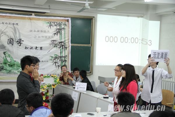 两场比赛分别有6支和5支队伍参赛,每队3人,共分“有问必答”、“比手画脚猜成语”、“快速抢答”三个环节。比赛随着主持人优雅深邃的开场白展开,“有问必答”环节,由于准备充分,各参赛选手都顺利作答,比分不相上下。随后进入娱乐与知识性并存的“比手画脚猜成语”环节,本环节需要各队队员密切配合,用肢体比划或“非人类语言”对成语进行描述,而主持人对“非人类语言”的示范更是让现场观众捧腹。本环节中表演最出众的“最炫民族风”代表队,在短短90秒内猜对15个成语,给其他各队造成了很大压力,现场氛围火爆。一轮激战过后,各个代表队分数逐渐拉开差距。第三环节“快速抢答”则将比赛推至了高潮,每题答对加200分的诱惑让选手们频频草率按下抢答器却忽略了比赛规则,只得遗憾扣分,当然也有抢题得心应手的队伍,“坝道忐忑队”代表队连连抢到题,将比分反超。比赛中,由魔术协会带来了精彩的魔术表演。最终,10级道桥代表队、11级土建二班代表队被评为“最佳班级风貌奖”,09级工民建二班“三种青年队”、11级水利班“坝道忐忑队”荣获“最佳团队奖”。