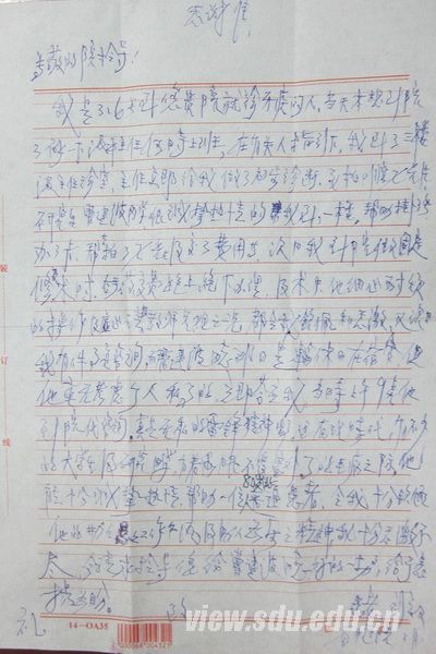 [本站讯]3月19日,山东大学口腔医院收到一封患者的感谢信,称赞口腔医院工作人员认真负责,特别感谢研究生曹建波在临床工作中服务热心,乐于助人。