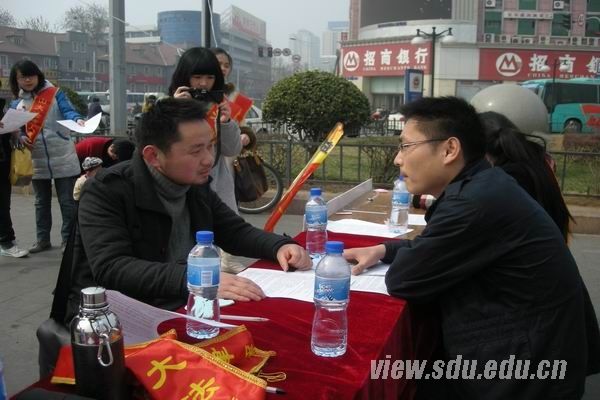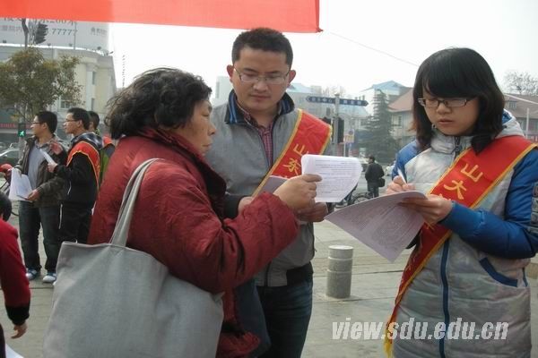 上午,法律援助中心的成员们在法学院团委相关老师的带领下,向洪家楼广场附近的居民分发普法宣传册,并对现场的居民进行了问卷调查。对于在法律方面有疑问的居民,法学院教师及山东嘉孚律师事务所的律师为他们进行了讲解。居民们热情高涨,对山大法律援助中心给予了很高的评价。他们表示,如果事先能够知道一些法律知识,在买到假冒伪劣商品时就不会生一肚子气、自认倒霉,而是会主动通过与商家协商等合理方式维护自己的合法权益,以后这种普法活动应该多展开一些。
