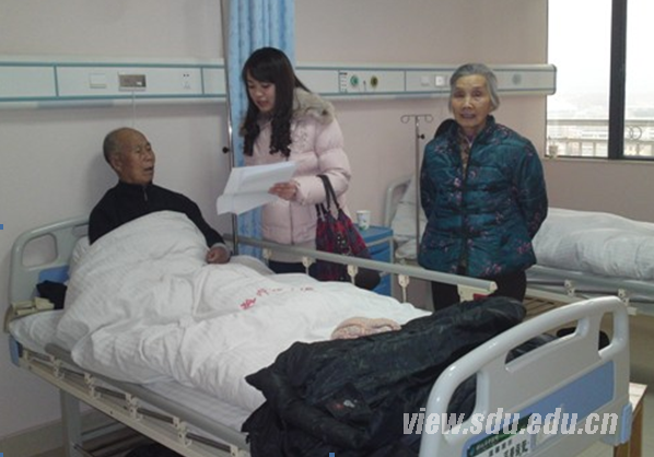 团队首先来到怀化市中医院康复科,在与康复科唐主任交流中团队得知,冬季因心血管病发病的住院人数比其它季节增加了5倍。在唐主任的支持与协助下,团队成员开始对病房病人进行问卷调查。团队成员细心与病人沟通交流,尽量不使用专业的医学术语,多在聊天中收集有价值的信息。团队成员懂礼貌的形象、专业的素养博得了病人及家属的信任,调研工作进展顺利。调研共发放调查问卷30份,宣传单50份。