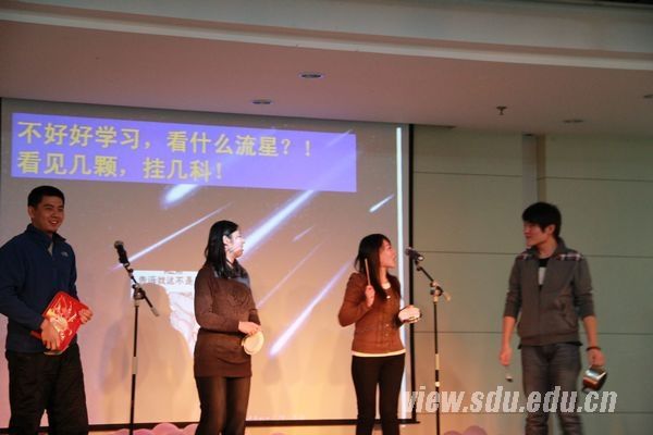李维林在晚会上致辞,他对同学们所做的工作和努力表示大力支持,对同学们的多才多艺表示了充分肯定,为同学们带来了新年的美好祝愿。晚会节目精彩不断,富有时尚气息与现代感的《T台秀》、三句半《校园生活》、充满童年回忆的歌曲《让我们荡起双桨》、山东快书《大实话》、洋溢着异域风情的《肚皮舞》、独唱《Shall we talk》、让人沉醉的男女对唱《美丽与勇敢》等精彩节目轮番上演,赢得了观众的阵阵掌声与欢笑声。秦川同学带来的歌曲串烧将晚会推向了高潮,引起台下观众的阵阵欢呼;王永军老师也上台献歌,使得现场气氛越加热烈活跃;孙永福带来的跆拳道表演让晚会再次升温,一块块劈裂的木板与砖块使在场的观众近距离感受到令人震撼的力量之美;活力四射的爵士舞《hoot》点燃了全场的激情,充分展示了经济学院研究生的青春与朝气;情景剧《白雪公主》融合了时下的流行元素,幽默诙谐,富有创意,赢得了观众们的阵阵欢笑和掌声。最后,在经济学院2011级全体专业硕士合唱的《朋友》中,晚会落下帷幕。