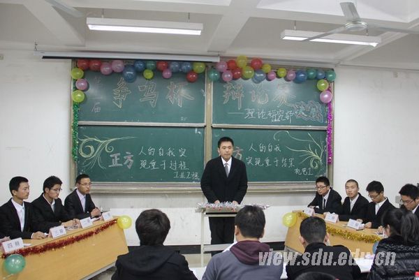 机械学院辅导员老师陈诚、王忠山和学生会新一届主席团成员担任评委,机械学院大一学生到场观看了比赛。在冠军总决赛前,工业设计辩论队和机电第二辩论队围绕“机械学院里男生与女生谁更痛苦?”的辩题为同学们献上了一场精彩的辩论表演赛。虽说是一场表演赛,但经过细心准备的正反双方各持己见,你来我往,互不相让,迅速活跃了现场的气氛。随后,一路过关斩将晋级决赛的工业工程队和机电一队两支辩论队,为争夺最后的冠军展开了辩论。正方工业工程队抽到辩题为“人的自我实现过程重于结果”,反方机电一队则相应坚持“人的自我实现结果重于过程”的观点。