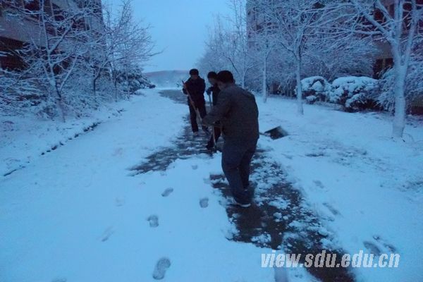 经过一个冬季的干旱,济南的雪终于送来她的问候,虽说姗姗来迟,却也总能缓解一下土地的干渴和空气的干燥。雪花无疑是美的,清晨,白玉兰路上呈现的雪景图更显纯美而让人心动;但是,也难免会出现一些同学因为路面太滑而摔倒在地的情景。这时,你一定会注意到拿着清扫工具的他们:清晨,雪地里最美的风景。