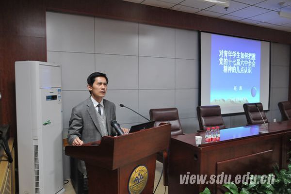 [本站讯]11月16日晚,经济学院在中心校区举办“学习十七届六中全会精神”专题报告会。山大党委宣传部赵海老师担任主讲,经济学院2009级、2010级学生党员、预备党员和入党积极分子聆听了此次报告。报告会由学院团委书记蔡清香主持。