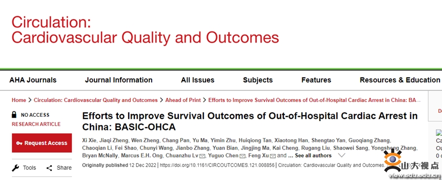 [本站讯]近日,山东大学齐鲁医院急诊科、山东省急危重症临床医学研究中心陈玉国教授和徐峰教授团队在Circulation子刊Circulation:Cardiovascular Quality and Outcomes(中科院一区,IF:8.271)发文“Efforts to improve survival outcomes of out-of-hospital cardiac arrest in China: the BASeline Investigation of Out-of-hospital Cardiac Arrest (BASIC-OHCA)”,介绍了由齐鲁医院急诊科团队牵头建立的国内首个全国性、前瞻性、基于人群的院外心脏骤停队列研究——“中国人群心脏骤停发病率、病死率及危险因素调查”院外部分(BASIC-OHCA)的设计、实施及运行情况。陈玉国教授、徐峰教授,四川省人民医院教授吕传柱为本文共同通讯作者,谢熙、郑佳琪、郑雯为共同第一作者。