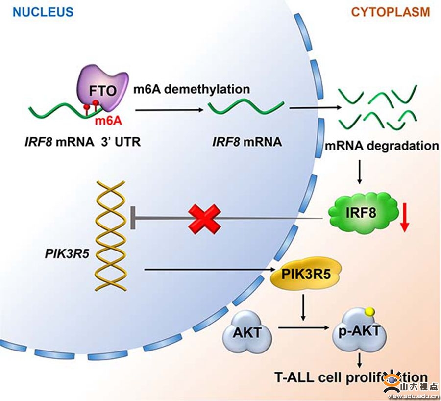 T-ALL是起源于造血干细胞的恶性克隆性疾病,预后极差,长期生存率仅25%—50%。探究T-ALL发生发展机制,寻找新的治疗靶点,具有重要的科学意义和潜在的临床应用价值。该研究通过多中心大数据分析发现IRF8在T-ALL患者中表达异常减低,体内外实验进一步证实过表达IRF8可负调控PIK3R5/PI3K/Akt通路,抑制T-ALL细胞增殖和自我更新,而体内敲除irf8可显著促进T-ALL小鼠发病。在此基础上,研究发现m6A去甲基化酶FTO通过调控IRF8的m6A甲基化对T-ALL发病起促进作用,并通过RNA-seq、MeRIP-seq及RIP-seq联合分析,明确了FTO通过m6A修饰调控IRF8表达的分子机制和具体位点。最后,在体内探索了通过靶向抑制FTO恢复IRF8表达对T-ALL的治疗效果。该研究首次揭示了IRF8在T-ALL发生发展中的重要作用,阐明了FTO通过调控IRF8的m6A甲基化修饰介导T-ALL发病的具体机制,为T-ALL的精准治疗提供了极具潜力的新方法。