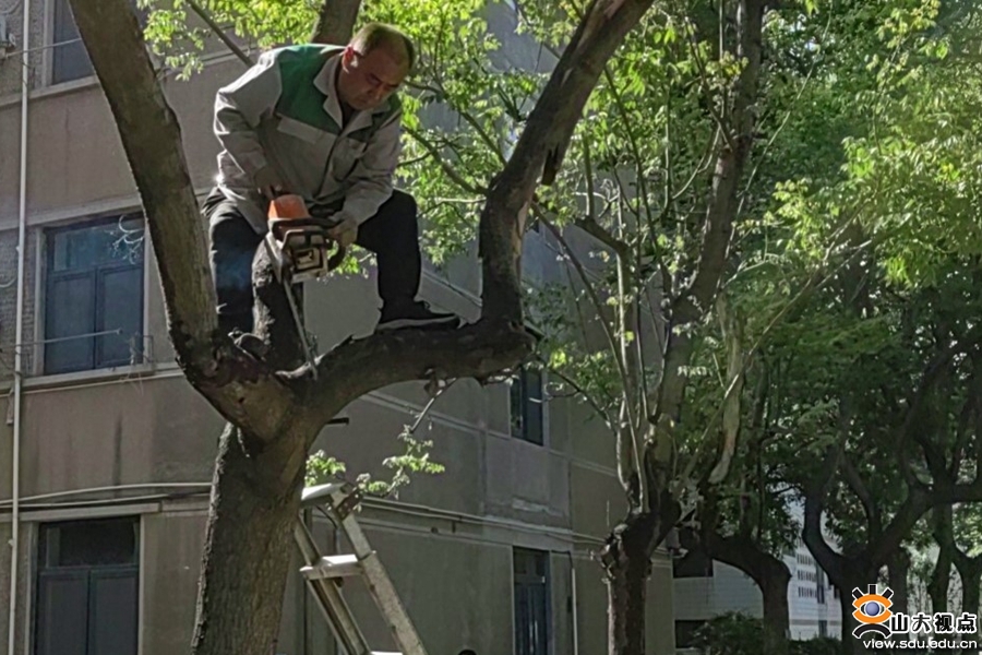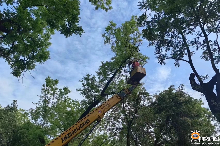 及时修剪危树枯枝。集中开展“修枯枝、清落叶、除隐患”专项活动,针对排查出的危险树木现状及分布情况,合理安排工序,利用扶梯和手锯配合修剪;清理出的枯树枝安排专车运至指定区域,保持路面整洁畅通,保障不污染校园环境与交通。为汛期到来及大风等恶劣天气做好前期准备。