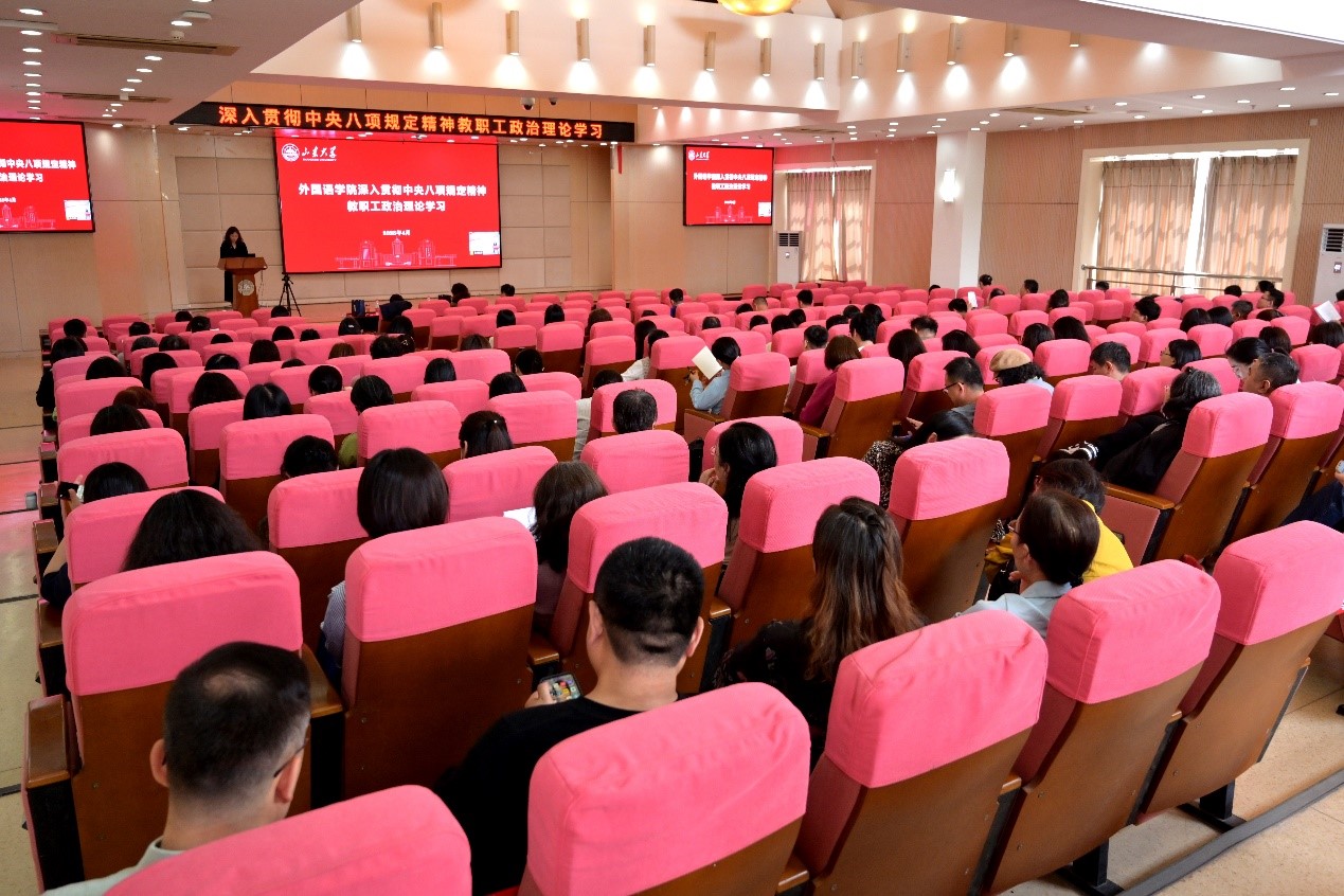 [本站讯]为深入贯彻落实中央八项规定精神,以优良党风正院风、强师风、优学风,4月17日,外国语学院在洪家楼校区组织开展深入贯彻中央八项规定精神教职工政治理论学习,就弘扬教育家精神、强化学术诚信开展专题培训。会议邀请学校党委教师工作部副部长石岩,学科建设与发展规划部副部长、学术委员会办公室副主任李晶晶作辅导报告。外国语学院党委书记刘华主持会议。