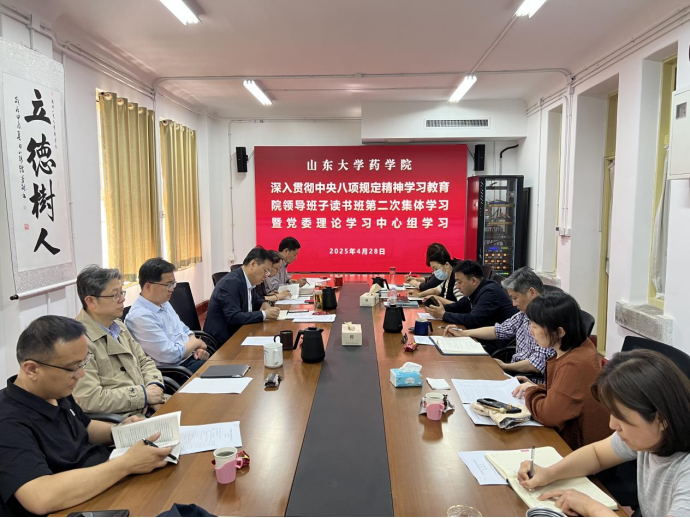 [本站讯]4月29日,药学院举行深入贯彻中央八项规定精神学习教育专题读书班第二次集体学习暨党委理论学习中心组会议,原原本本学习《习近平关于加强党的作风建设论述摘编》。学院党委书记王秋生主持会议,学院领导班子成员、党委理论学习中心组成员参加会议。