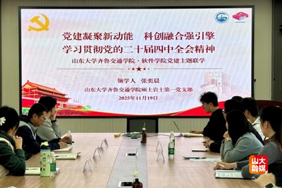 [本站讯]11月19日,齐鲁交通学院硕士岩土第一党支部与软件学院人机交互与虚拟现实研究生党支部在软件园校区联合举办“党建领航,智慧交融:人工智能赋能新时代重大工程”联学共建活动,软件学院党委副书记周广鹏、齐鲁交通学院党委副书记张瑜参加活动。